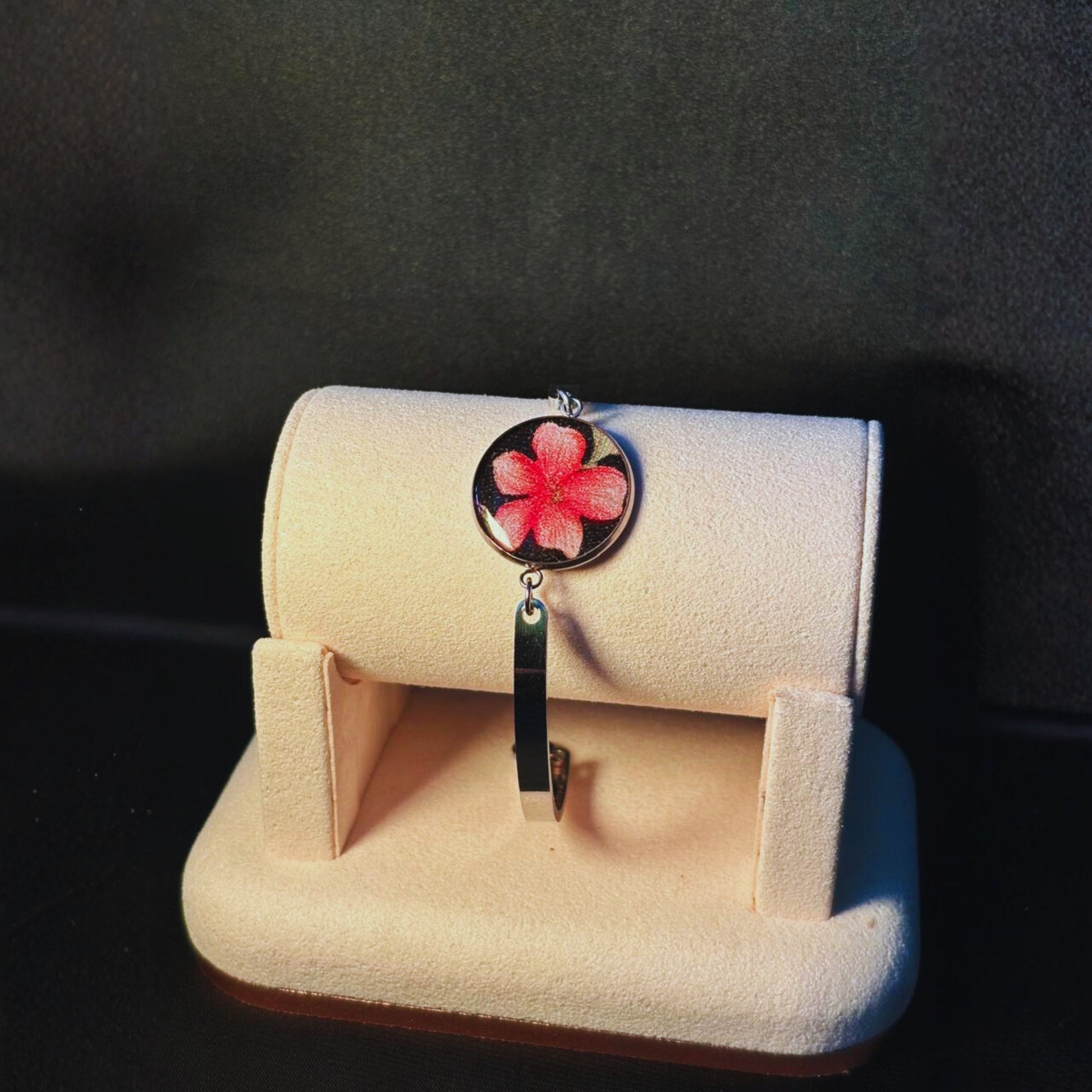 Style: A clean and elegant piece with a pink blossom and silver band that adds subtle sophistication